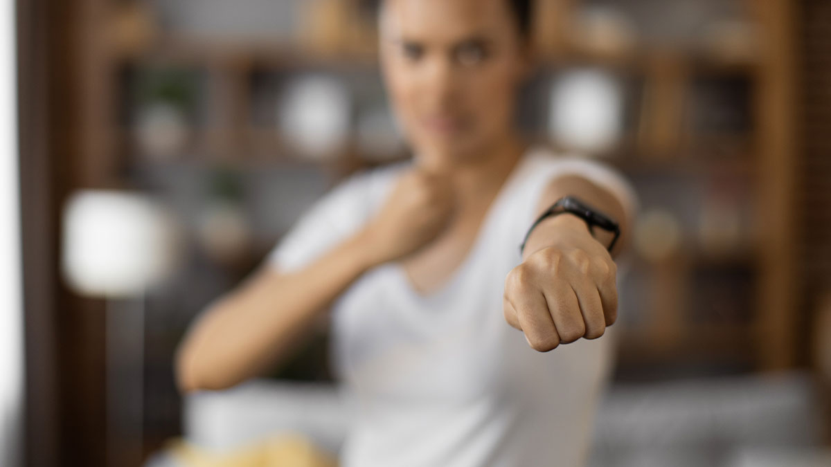 Woman showing a clenched fist in a tense moment, symbolizing conflict and divorce papers in a home setting.