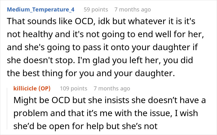 Load More Replies...What's with the uninformed, uneducated mental health diagnoses? That's not OCD. That's someone who's gotten social media attention as their priority over her own family and marriage. She'll regret it one day. This father should have full custody with the divorce, and the mother should be monitored to ensure she's not exploiting their daughter for clout. I hope some laws come into place soon to make it officially illegal to use children for the sole purpose of making money on social media, and failing to provide a reasonably safe, secure and private home life for the child.