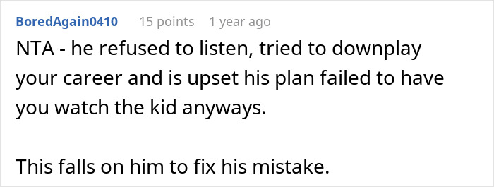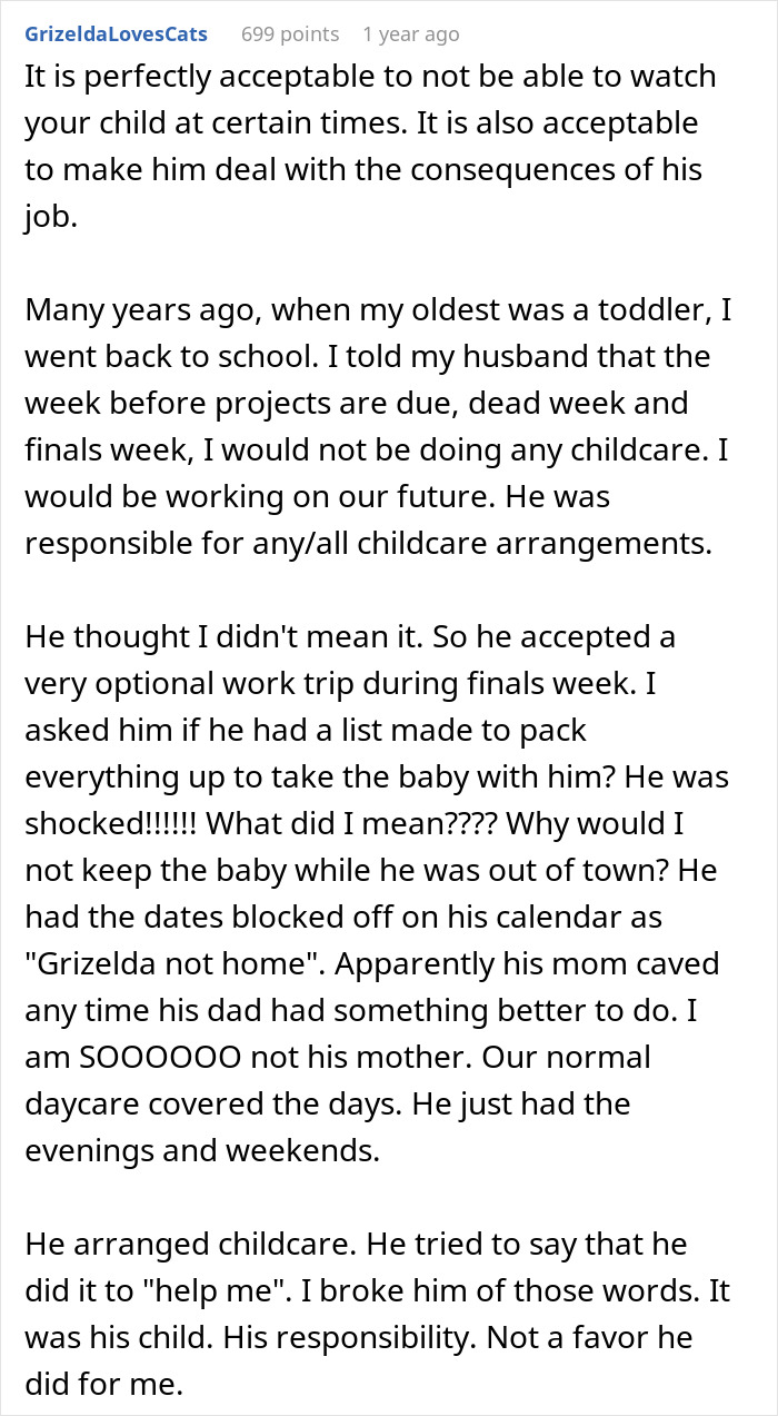 Load More Replies...I don't understand why women comply with this c**p. If my husband tried that, I'd either just make the arrangements myself or make sure I leave first in the morning so he's left with the baby. We can talk about divorce when I'm back from work if he still doesn't get it by then. If his mother doesn't like it, she can go on the no-contact list so she doesn't have to know about it.