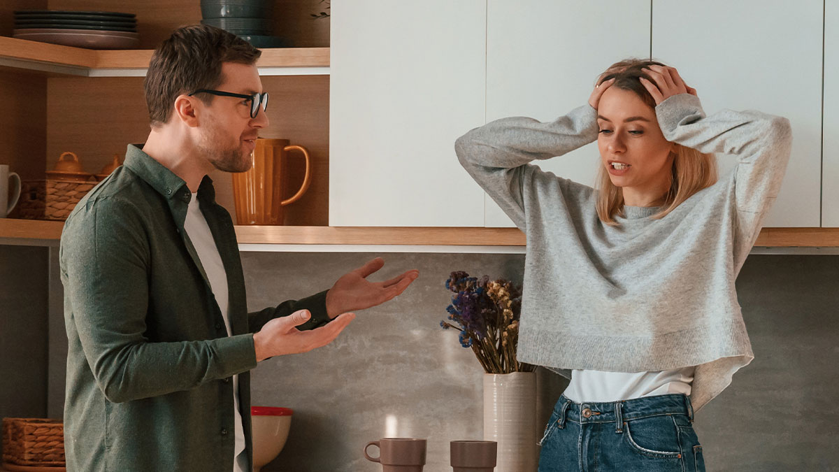 Man and woman in kitchen, discussing weaponized incompetence during an argument.