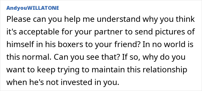 The poster feels left out because of this, but she thinks that it’s her problem to deal with. However, one day, this completely changed after her husband sent her a “spicy pic” (with him in just his boxers). Well, the main issue was that he sent it to their friend 10 minutes before he sent it to OP. She found out about it when she went through his phone, so now, it’s gnawing at her.