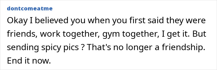 Load More Replies...Even if there's no hanky-panky going on, he's cheating on her with his time. That's too much togetherness with another person other than your supposedly "significant other."