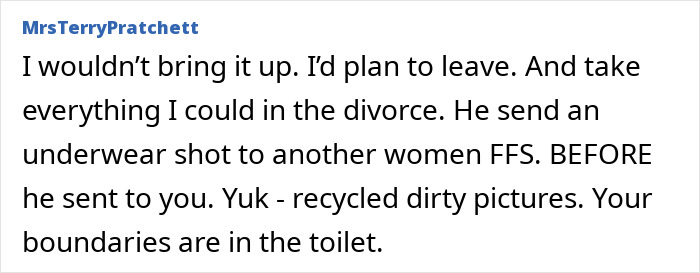 She didn’t want him to find out that she went through his phone, so she sought advice online and asked how to navigate the situation. However, folks were absolutely flabbergasted by her husband’s behavior. They said that he would cheat on her the first chance he gets (or might’ve already done it), and many advised her to just end things.