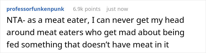 Load More Replies...As a HEFTY meat lover, what is his problem??? I'd be over the moon for my partner to make me delicious food, vegan or not, as long as they're not forcing it on me, which he clearly isn't. Why is it just because I won't become vegan and love meat that suddenly i'm supposed to avoid vegan food like a plague? Eating vegan food is not gonna hurt you and you can still eat meat. Making you something vegan doesn't mean she's trying to convert you, you weirdo-