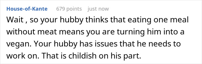 Load More Replies...The non-cooking partner sounds like they had a really tough day, and instead of accepting the meal they interpreted it as an attempt to change them. The husbands need to sit down and talk. It's perfectly reasonable for a vegan to make vegan food, and if others want to eat the food, that's great. It doesn't make them vegan, and it isn't even an attempt to 'turn them'. It's just good food. If the meat-eating husband wants to eat meat, that's fine, but it's not fine to expect the vegan husband to be making meat-based meals. ... Just accept the tasty food, thank the cook, and eat.
