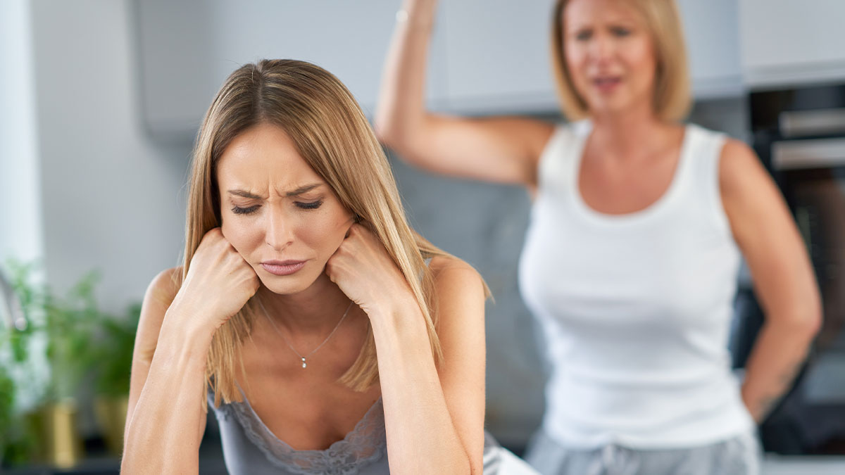 Woman upset at kitchen counter with another woman angrily gesturing, illustrating husband not standing up to his mother conflict.