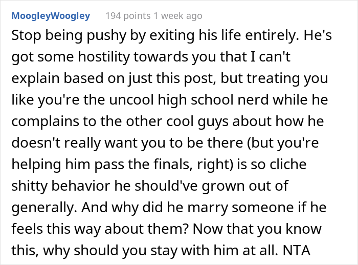 Once the man got back, he went off on the OP, arguing that what she did was “disrespectful” and “juvenile.” Of course, she told the truth about overhearing that rather insensitive conversation, to which he responded by slamming her for eavesdropping. He also added that his family would eventually warm up to her, she just needs to stop pushing the idea of being around them when they don’t feel comfortable, basically hinting that the woman was to blame for coming along in the first place.