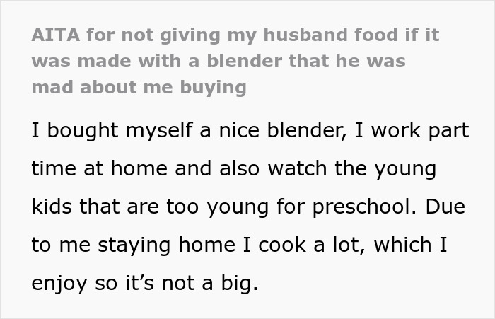 On that note, one Reddit user shared her story online asking if she was in the wrong in this situation after she bought a blender and kept hearing her husband’s complaints that this purchase was just a waste of money. Well, after she’d had enough, she simply didn’t share food made with it with her husband. And as the author shared in the end, this post made her question her marriage.