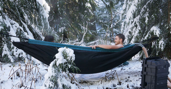 The hammock itself is made of resilient and waterproof tensile fabric that, according to the video on its Kickstarter campaign, can hold 2 adults and about 50 gallons of water. The heating system currently runs on natural gas, though there are plans to expand to battery and solar electricity as well. A double-walled model lets you insulate it and use it during the winter, too!