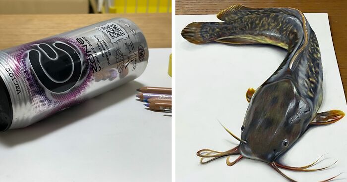 The works of this Japanese artist named Aria might leave quite an impression on you given that the artist is completely self-taught. Aria makes hyper-realistic 3D drawings that seem to come out of the paper as the artist makes it seem as if it's just an optical illusion. From random inanimate objects such as soda cans to fruits, the art is detailed and impressive, to say the least.
