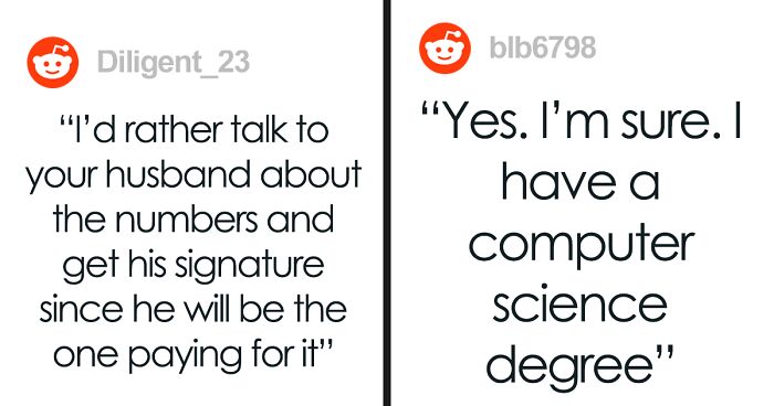 My husband and I wanted a fence around our house. A man came over to give an estimate during a workday. I was ready to sign the papers, and he said, 'I’d rather talk to your husband about the numbers and get his signature since he will be the one paying for it.' I asked him to leave my property and never come back. I have always worked from home, and my husband has always worked in a field where he cannot take time to meet with contractors, etc. He and I agree on terms upfront, and then I make decisions from there. It doesn’t matter in life, but for this story it does: I make more than my husband. For the fence, we had already agreed on this company based on various factors, and the estimate had ended up being less than we expected to pay. We had already agreed on this company based on various factors. A man came over to give an estimate during a work day, which ended up being less than we expected to pay. I was ready to sign the papers and he said “I’d rather talk to your husband about the numbers and get his signature since he will be the one paying for it” I asked him to leave my property and never come back.