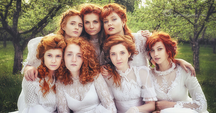 I’ve dressed up seven redhead ladies in authentic lace vintage dresses. Picked up the right props and found a spectacular location, suitable for my photo series. It should have been a white blooming apple garden. But, unfortunately, a strong wind in the evening blew all the flowers away.