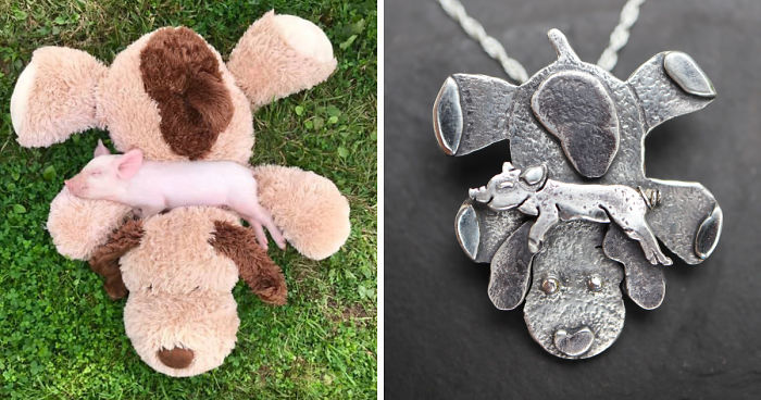 I created this recycled sterling silver pendant to resemble Max the piglet with his stuffed puppy friend after falling in love with his story. A couple was driving down the road and saw Max, the tiny piglet, fall off of the back of a livestock truck heading to a slaughterhouse. Thankfully, and kindly, they picked him up off of the busy road and found Todd of Arthur’s Acres in New York and asked if he would help heal him and give him a forever place to be safe. There was no question at all that Todd would give this to Max. This is what Todd does. He has opened his home to so many pigs (and other animals!) in need of safety, vet treatments, and love.