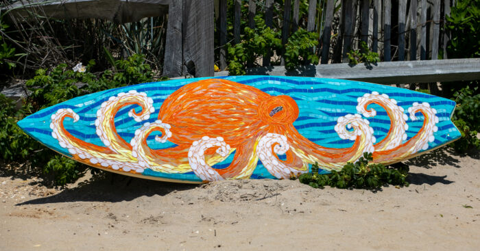 I've been making glass mosaic surfboards from recycled boards since 2014. I normally make one a year and sell them. Each one is hand made and unique, some being embellished by fused glass that I make as well.