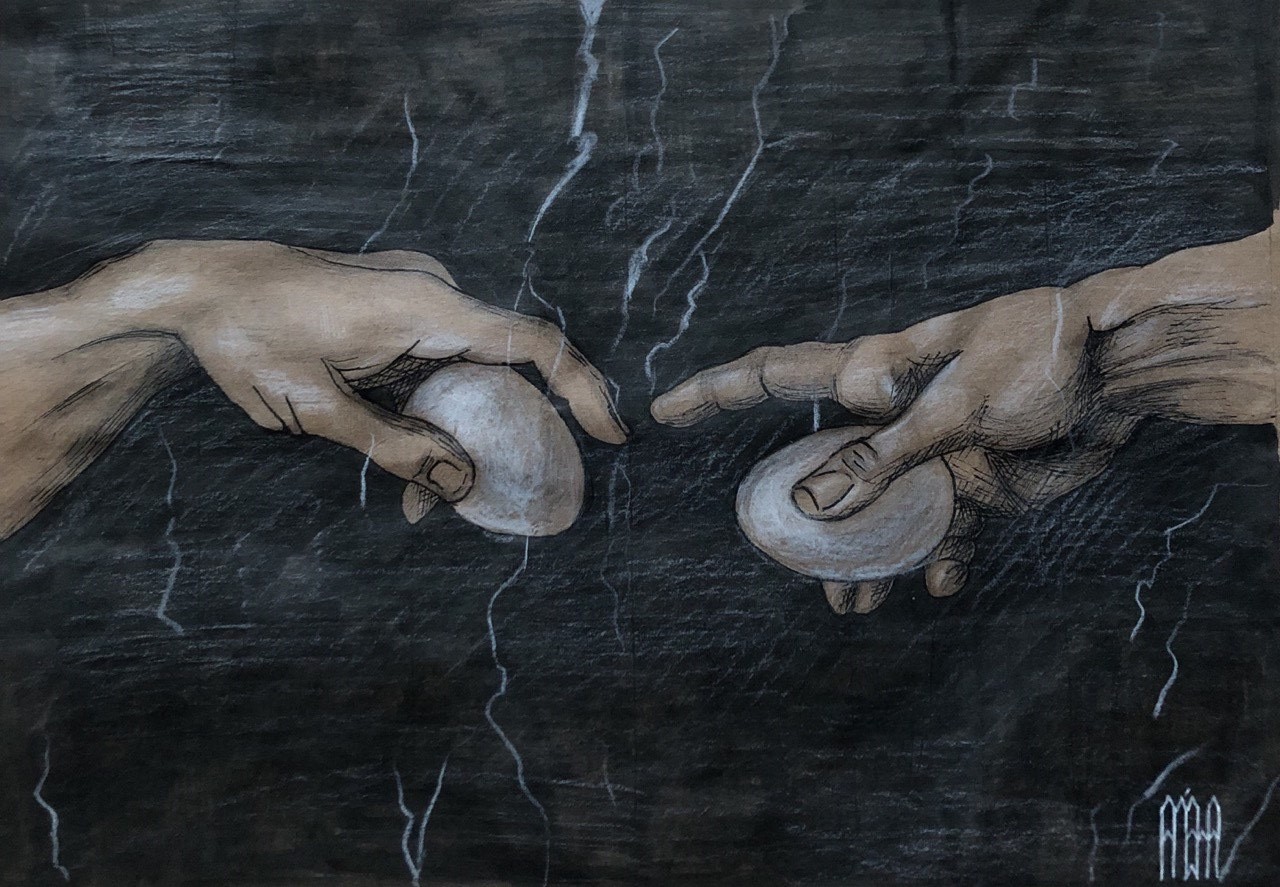 My name is Alyona, I’m an artist, and I created an image with a simple pencil and marker, like two hands reaching out to bang for Easter.