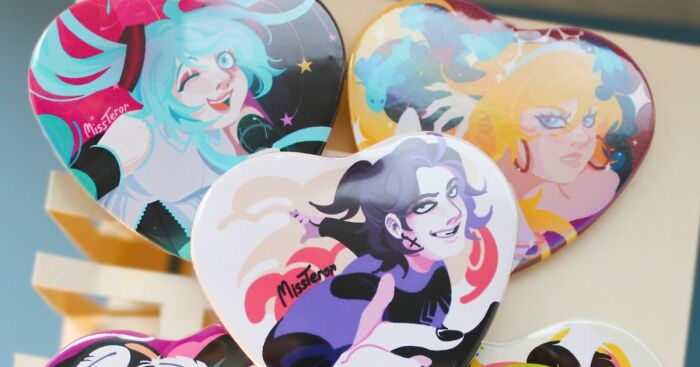 “I love mixing sweet and spicy,” says the artist. And that chaos is beautifully controlled. Her characters leap off the canvas — or, more often, off collectible heart-shaped prints and pins — with an explosion of stylized hair, glossy eyes, swirling patterns, and candy-bright palettes.