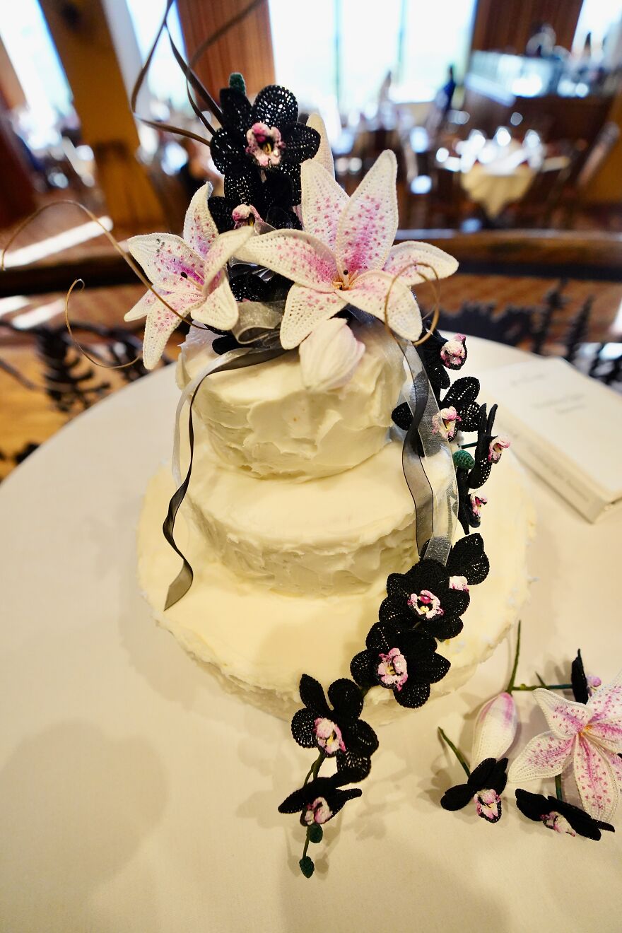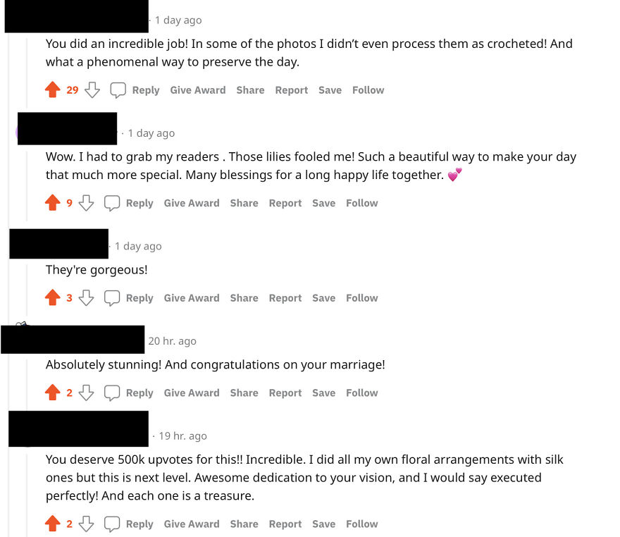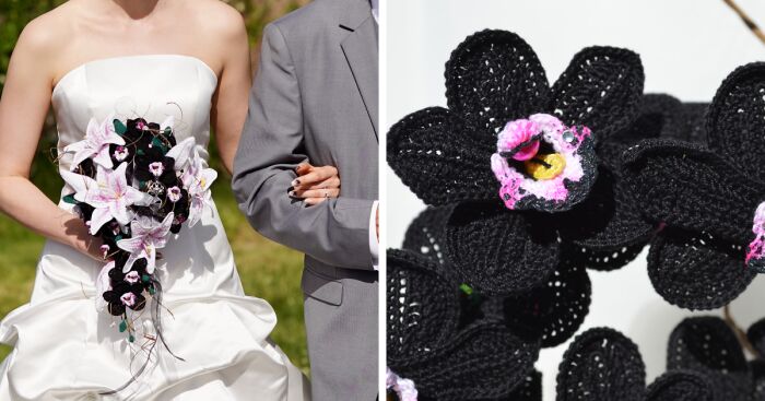 When I got engaged I knew I wanted very specific flowers for my wedding (lily and black orchid) but refuse to pay hundreds/thousands of dollars for something that will die a day later (and the black orchid is rare). I decided to design and crochet my own flowers. It cost about $150 USD (with shipping to the US) and over three years of my life. Every flower and leaf was crocheted and hand painted by me. I never really tried flower arrangements but I think they all turned out nice.