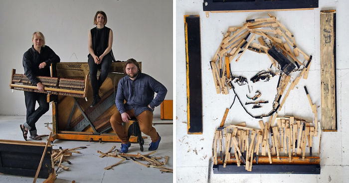 We took some tools like axes, hammers and saws, and invited a pianist to play one last song with that piano. During the pianist’s play, we took a piano apart. After five minutes it was impossible to play, because piano fell down. It was a little bit sad, because the song was so short. After that ceremony, I made a portrait of Beethoven. I used almost all the piano parts for this portrait.