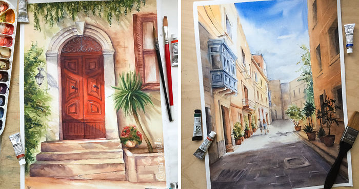 So this time I’d like to show you a very sunny country – Malta. I love painting Maltese landscapes and doors with watercolor – they are very unusual and inspiring. To tell the truth, for me the whole country is inspiring: fantastic Mediterranean sea with its clean water, houses built of sandstone, so different and unique doors with door handles, balconies, silent and narrow streets – you want to paint everything!