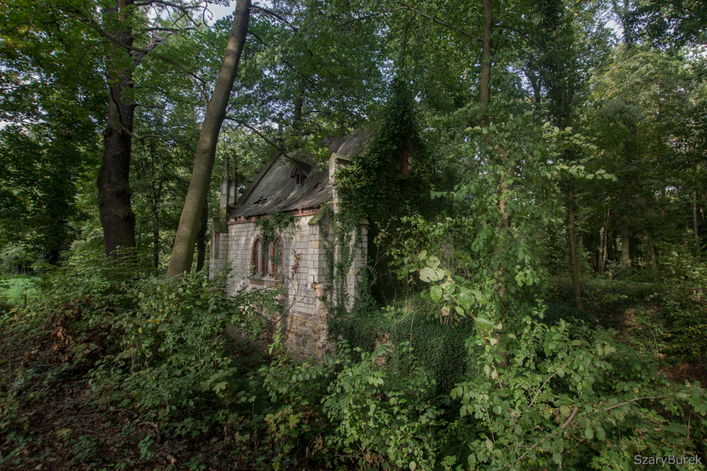 heavily overgrown, historic chapel in the neo-gothic style located in a palace and park complex near Krapkowice, voivodeship Opole Province. Found by accident during a trip to the castle in Moszna. It was built in 1882 for members of the Seherr-Thoss family, it was situated on a small artificial hill. Most likely, in the center of the chapel there are six funerary niches in which four people were buried. In 1945, the body was desecrated in the facility by soldiers of the Soviet army. When in 2001 the palace and the adjacent park were purchased by a new investor, the entrances and windows to the tomb were unfortunately bricked up. Also, I only had to photograph it from the outside and you can see these photos below.