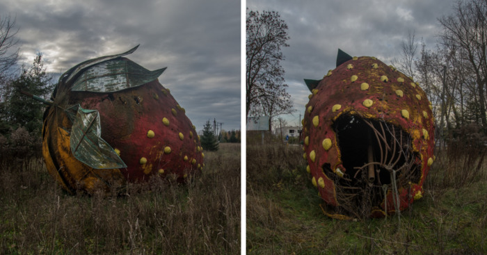 Such a large, abandoned strawberry can be found on one of the plots near Warsaw. This fruit once stood proudly along the road and advertised one of the gardening companies. Now it lies and rusts.