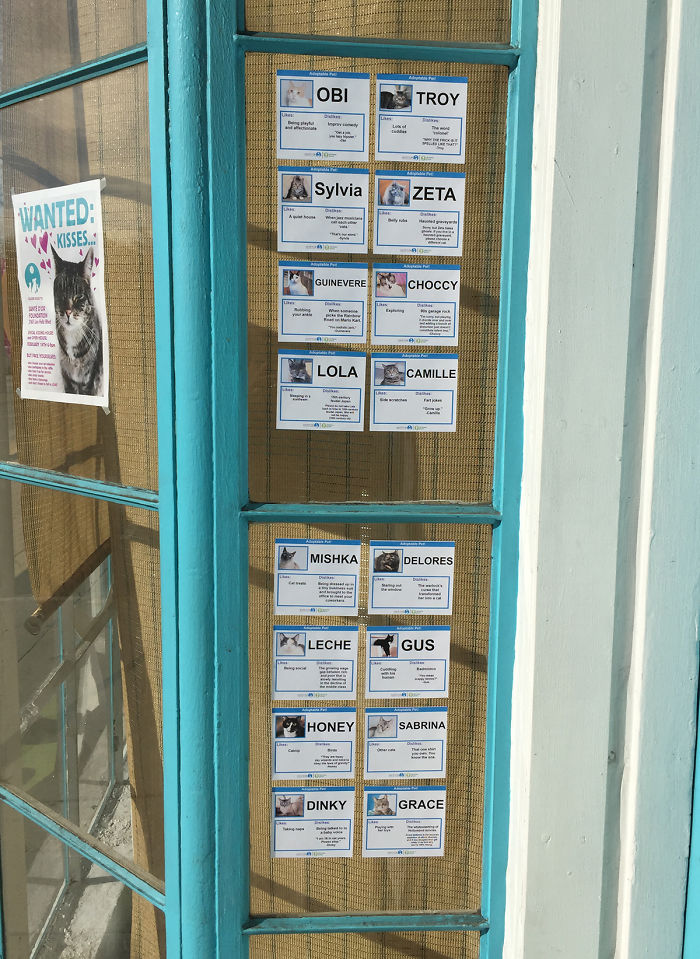 Every year, 2.7 million cats go unadopted. To help out my local adoption center in Los Angeles, I stealthily placed these cat biography cards on their front window. All of these cats are real and need a home! Check out Sante D'Or Adoption Center for more info on each cat.