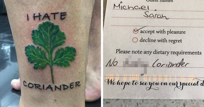 If you feel that memes aren't going far enough to show off your hatred for the vile herb that is coriander, consider a more permanent way to display your beliefs. There's undeniable photographic evidence that there's at least one person on planet Earth with a tattoo of coriander encircled by the words "I Hate Coriander". Now, that's what I call dedication.