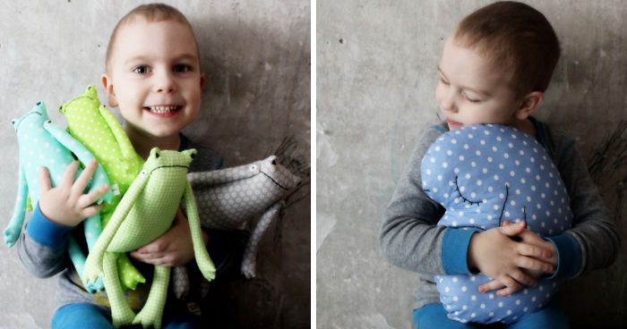 I’m Olena, a fulltime crafter and owner of HandyHappyShop. Once I was looking for a background for my new stuffed toys collection and stopped my eyes on one of the walls in our dinning room. My 4 years old son has ripped wallpaer off it and added some abstract masterpiece over the bare wall so it looked really ugly… but more I was staring at it more beautiful it was starting to look for me. Hmmmm… And I had an idea! In a minute I gave a first toy to my son’s hands and have made him stand on the top of our armchair in from of the best background he made for me. And see how it worked. The other model is my sister. And I love these photos and happy I was that kind of moher who let her toddler to ‘redecorate’ the wall in his way. :-)