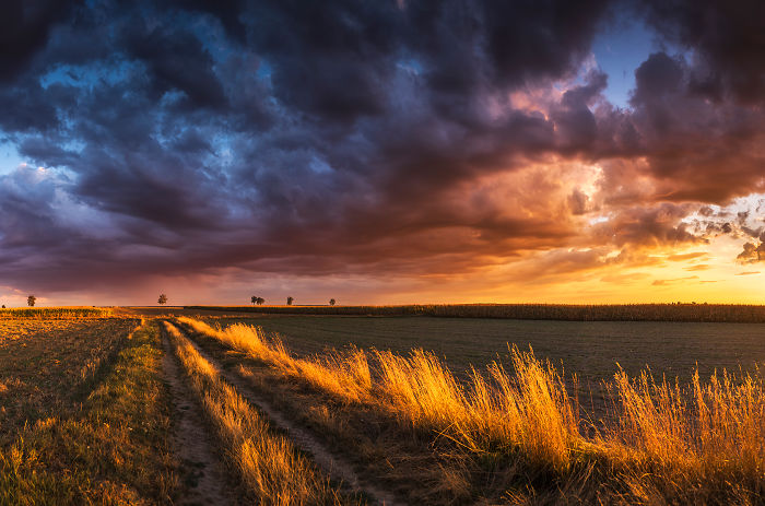 Couple of weeks ago I decided to spend evening riding a bike around “boring area”. I noticed the weather was not perfect. Heavy clouds covered the sky. But I took my camera with me. When the sun was about to touch the horizon clouds turned pink, orange and bloody red. It was the first time in my life when I saw the red rainbow. Alone trees became my models.