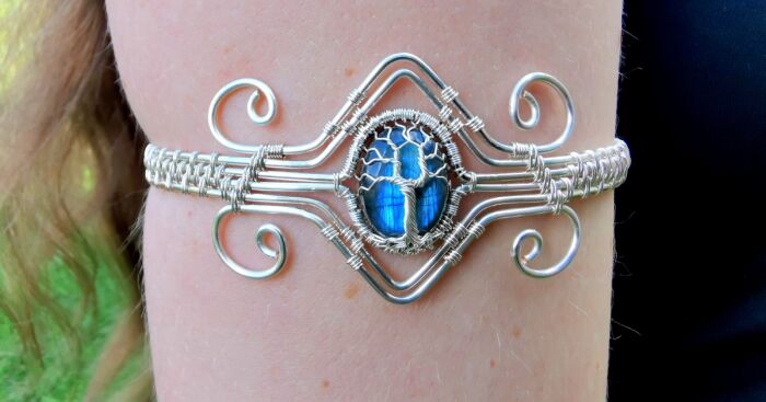 I design and craft fantasy-inspired jewelry with wire and gemstones. For this elven tree armband, I used approximately ten meters of coated copper wire and a labradorite gemstone. Copper and blue stones are my favorite combo when crafting.