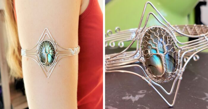 I design and craft fantasy-inspired jewelry with wire and gemstones. For this elven tree armband, I used approximately ten meters of wire and a labradorite gemstone.