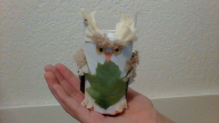 I used some fake flowers in other projects, and the leftovers were used to create these adorable little guys. I used recycled toilet paper rolls with the ends folded down to create the shape, then covered the cardboard in paper and leaves. This overall took about 15 minutes per owl and cost about $5 for both (rounding up). This rainy day was not a waste!