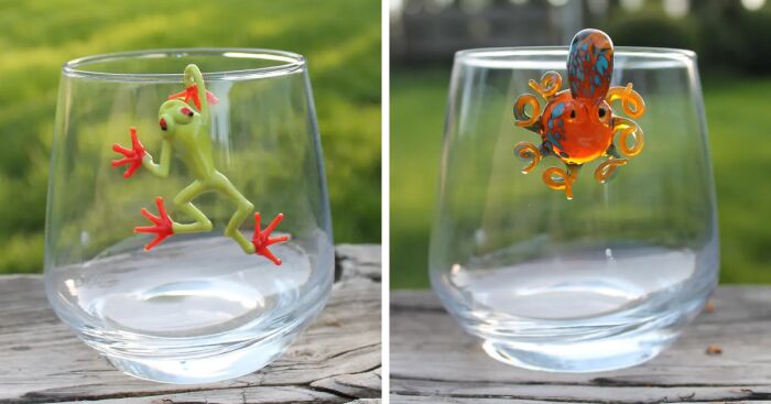 These glass figurines are handcrafted to cling onto the rim of a glass. Each one is removable and can be placed on any glass surface — perfect as a quirky decor touch or a fun conversation starter. The frog and the octopus both grip securely and are made from solid glass without any glue or magnets.