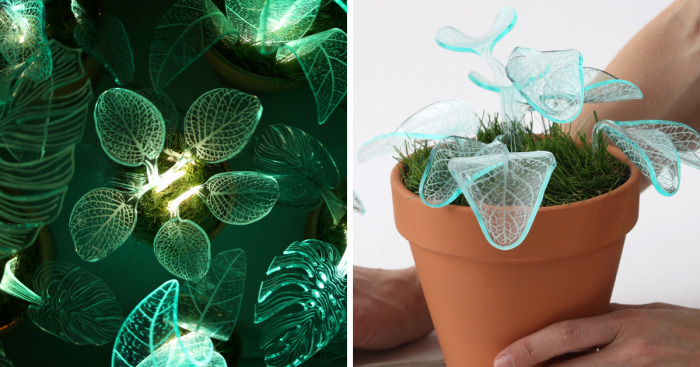 Powered by LED The Acrylic leafs conduct the light through the engraved veins all the way from the base to the top of the plant, making a soft green light.