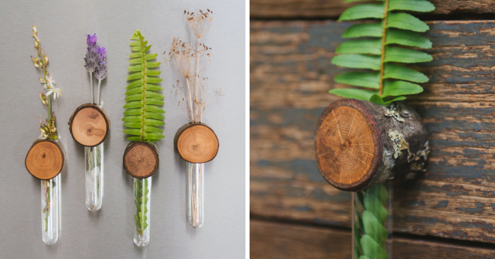I work a lot with wood that I find lying around and in my aim to be able to use every part of a tree I came up with this product: magnetic stem vases!