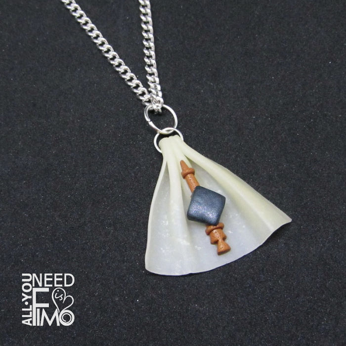 I’ve always loved Harry Potter books since I was a child, so I decided to make this Deathly Hallows inspired charm for necklace. I make it in a unique way realizing realistic Invisibility Cloak, Elder Wand and Resurrection Stone out of Fimo effect.