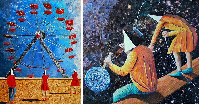The technique that I use is called paper painting. This is something based on a collage. I’m trying to get the effect of oil painting with irregular brushstrokes.
