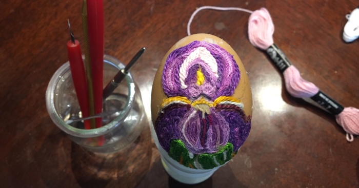 Every year my family sits down together to make Easter eggs. One year I decided to take a different approach with my wydmuszka and started to put embroidery floss on it. Ever since then Ive tried to create increasingly complicated images. It takes me several hours to complete an egg. Ranging from 4 hours to 12 hours – the time dependent on the design.