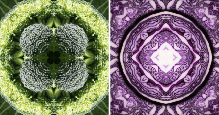 Ever since I have been photographing and editing raw vegetables into mandalas that have grown in complexity and beauty. I am amazed at the patterns that mother nature offers us in her beautiful food and I spend hours every week examining, photographing, editing and eating these gifts of light and color.