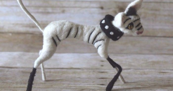 I have a friend who raises Sphinx cats which are a breed of cats that don’t have any fur. They are basically bald and beautiful with every wrinkle and curve showing. My friend convinced me to try to make a needle felted version and here is the result!