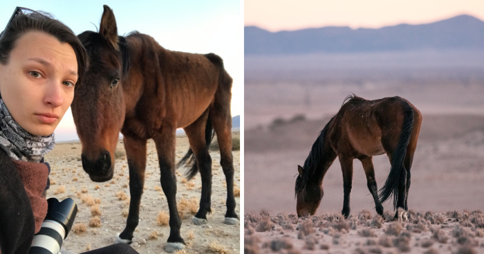 With the first morning light my fellow traveller Nina and I set out on the last day of our stay in “Aus” to look for the wild horses. Still during dawn we saw a stallion standing next to the road. He was on his own. If he was too weak to follow his herd or if he decided to search food alone was a question he did not answer. The first thing I realized was how thin he looked despite his winter coat. His pelvic bones and withers sticked up high from the rest of his body, his throat was barren. Our presence didn’t bother him, he focused on his search for food. The few tufts of grass on the ground were chewed down or dried up. At some point he decided to inspect us. This time my eyes caught his. They were sticky and kinda sad. And somewhere very deep down, I saw a small sparkle of wilderness hidden in them. Such as a small light which refused to be extinguished. His expression was questioning. But not as in „Who are you?“, like I’m used to from the wild horses I met in Bosnia. More like: „Do you have anything eatable?“