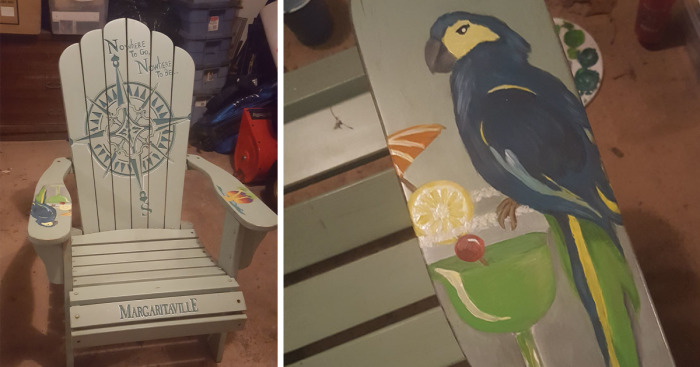 My boyfriend’s dad loves anything with Margaritaville-themed so this past summer I revamped his monochromed adirondack chair with Jimmy Buffet themed logos and slogans.