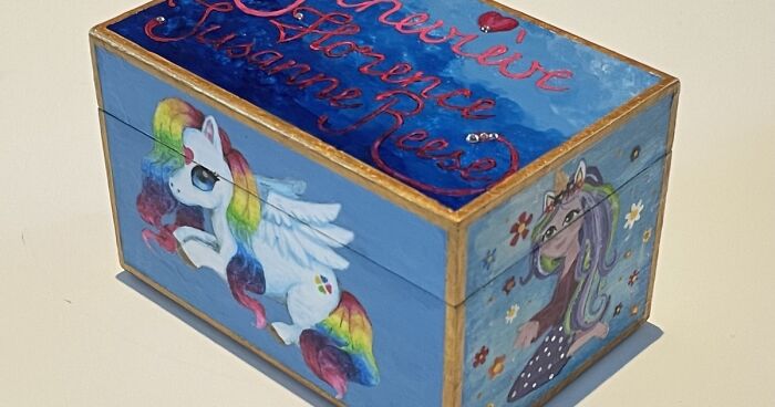 When choosing the pictures to paint on the box, my 5-year old unfortunately walked in and wanted to chose pictures she likes which ended in a few I honestly wouldn’t have chosen myself, but she loves her box, so who am I to kill her joy!