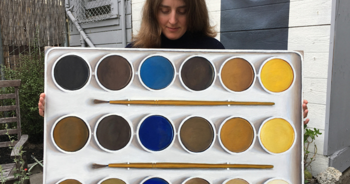 Emily Wick with Portrait of a Color Blind Artist’s Watercolor Tray, Oil on Wood Panel, 2016