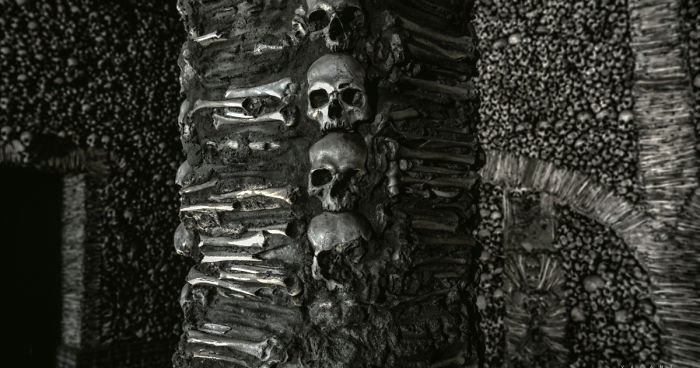 There's a similar one in Evora - Portugal And it says at the entrance: "Nos , ossos que aqui estamos, pelos vossos esperamos" (we, bones here, for yours we wait)