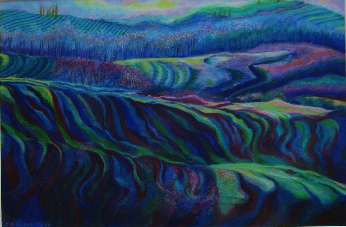 from a photograph I saw of these Italian hills that looked like they came from some fairy tale story but really looked very close to this. Not sure how geographically these fields got this look but had to capture them with colored pencils and a lot of oil pastels.