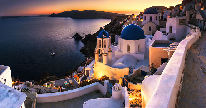 Dusk over Oia and the most famous building on the island – Three Blue Domes