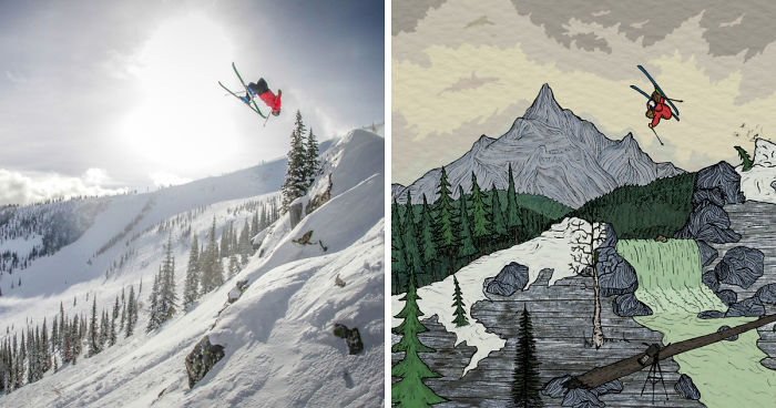 I love skiing, and being in the mountains, and I spend a lot of time thinking about skiing so I tried to work as a ski photographer, but instead I ended up drawing pictures instead of taking them with a camera.