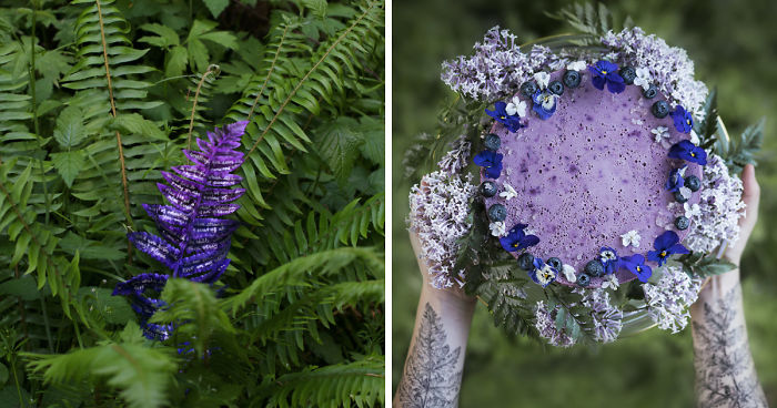 For “Lady Fern’s Soiree,” I wanted to attract curious strangers, so I painted some ferns purple and wrote my invitations on them, then hid them in clusters of real ferns near Eugene, Oregon