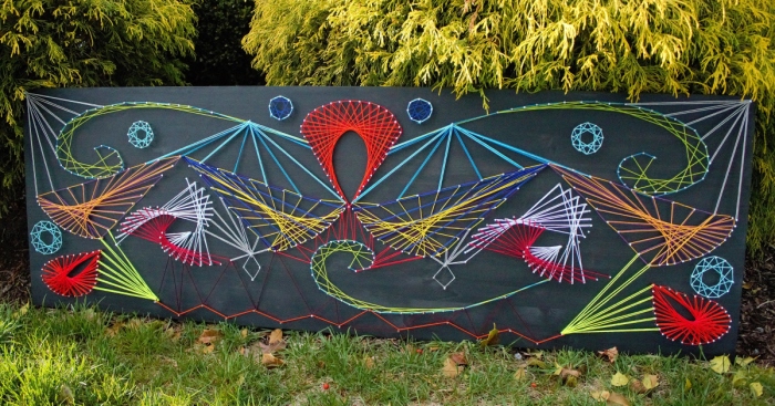 Don’t stare too hard! The shapes and bright colors contrasted with the black wood gave this mini DIY adventure a hypnotic result. I placed nails around simple, geometrical shapes on black stained wood and used embroidery floss to embellish. Drawing the shapes on attached white paper helped with nail spacing, however it didn’t look like much until the paper was removed near the end.